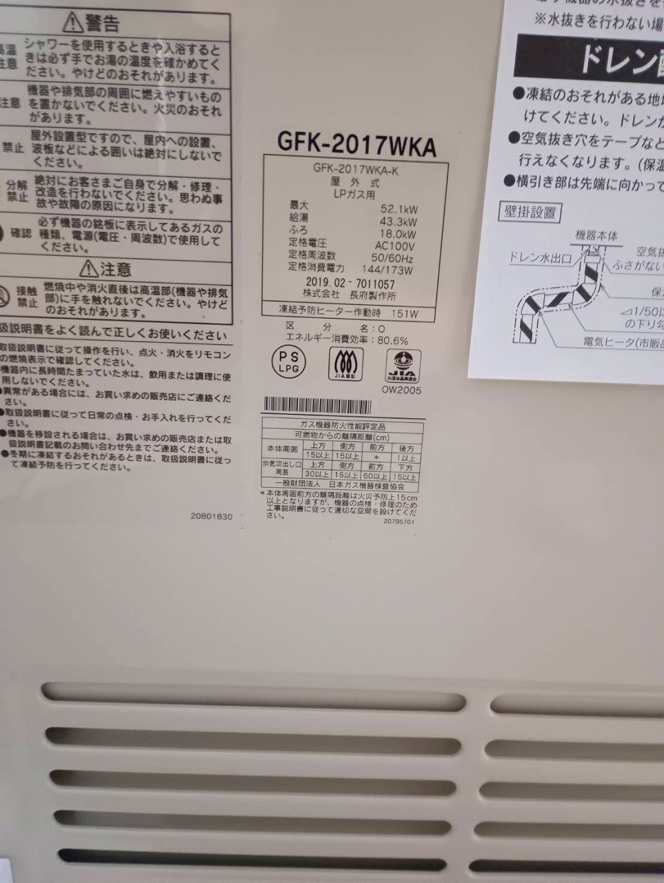 | 通 称 | 強制追い炊き付きガス給湯器 |